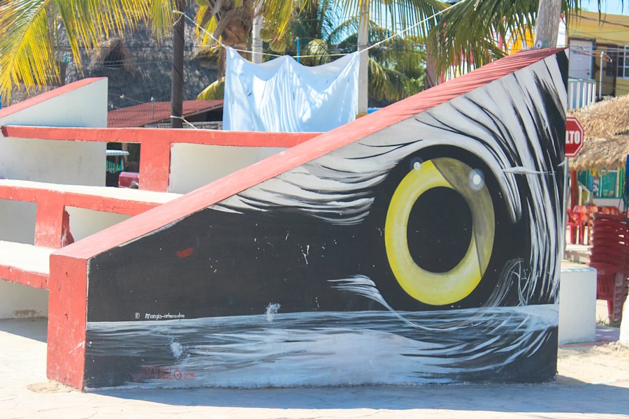 - Murals 7-16 are all around this little strip. From El Cafecito, keep walking parallel to the beach along Calle Pedro Joaquin Codwell. On the corner with Calle Esmedregal on your left, there are two murals on each side of the street (7 and 8). Walk a little up Calle Esmedregal (turning left from Pedro Joaquin) as far as Avenida Damero, and murals 9 and 10 are on either side of the street by restaurant Miriam. This is a great little eatery with very fresh fish. Take a U-turn and walk back the way you came towards the beach, cross Avenida Pedro Joaquin Codwell and on your left opposite restaurant Las Panchas you'll see murals 11 and 12. Las Panchas is an institution on Holbox and is a must while on vacation here.