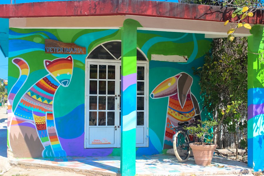 - Go back onto the main Avenida Joaquin Codwell and continue walking a little further. The last three murals in this area are on your left. Two of these belong to businesses - Hostel Bucaneros and Veterinaria Isla Holbox. We love the graffiti-style of the hostel and the painted animals on the veterinary are adorable.