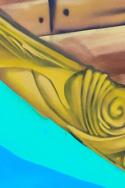 - Start off in the main square. It is here where you will find the first 4 murals on our walking tour. Step behind the acoustic amphitheatre and admire the decorated dome. If you're facing the dome from behind, to your left, you'll see a sheltered area where mural number two (an abstract man fishing) can be found. Walk towards the basketball court: on the sides of the seating area, can you find murals 3 and 4 – a bird's eye and a small girl with a mask?